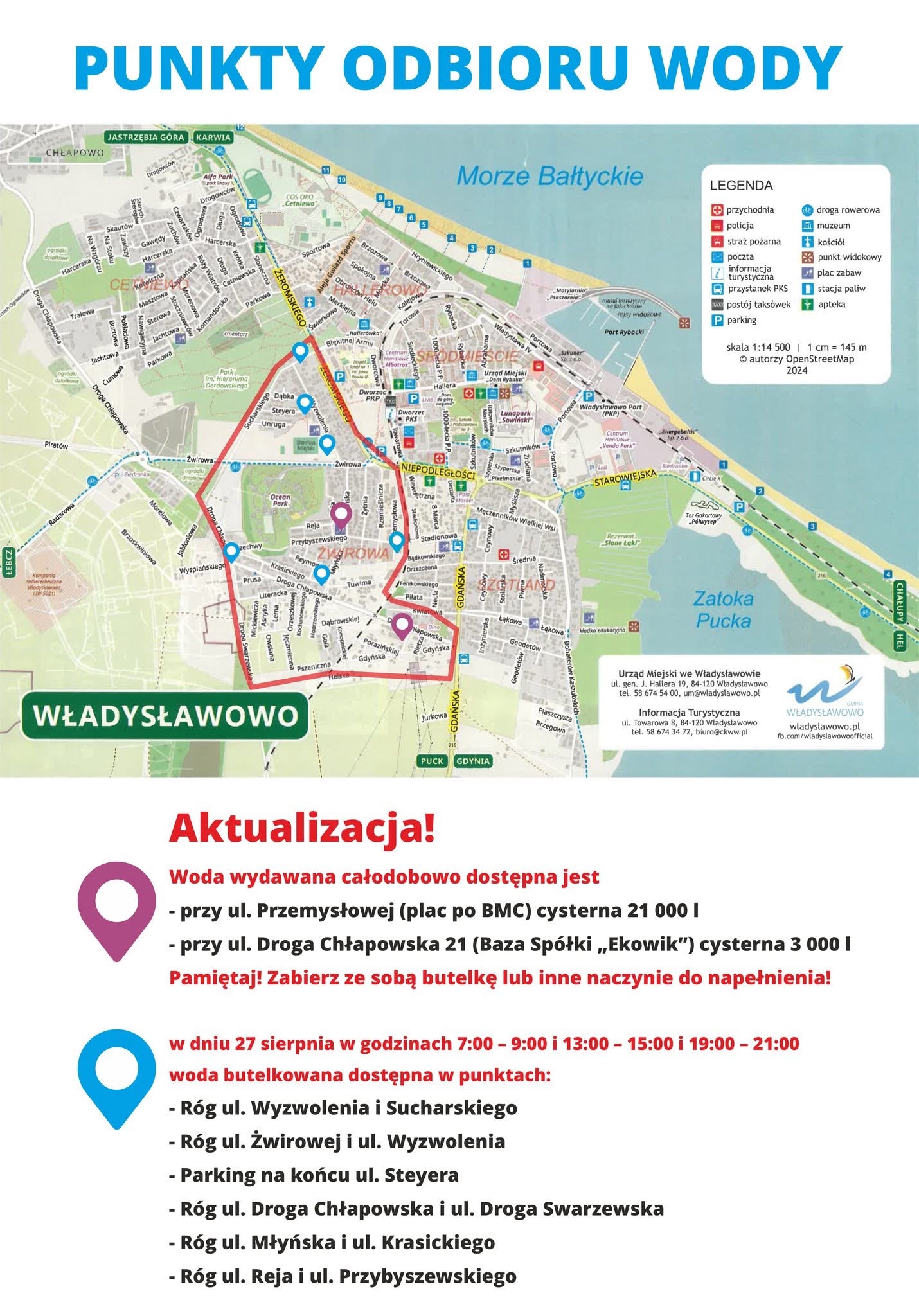 W związku z ograniczoną ilością wody butelkowanej, prosimy o pobieranie wody z cystern dostępnych CAŁODOBOWO, zlokalizowanych: